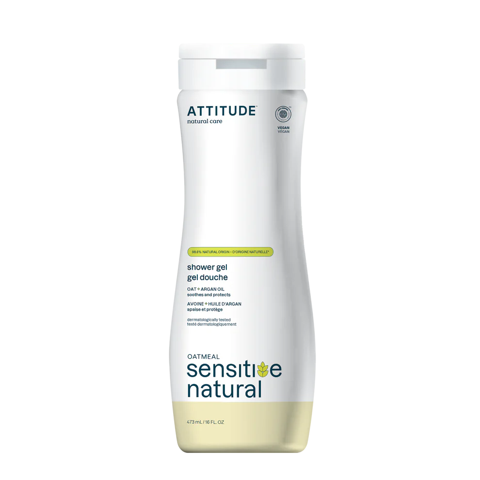 - Ease your way into the day and treat your skin and your senses with our comforting natural ATTITUDE’s Sensitive Skin Shower Gel. This lathering shower gel blends soothing ingredients and is enriched with oatmeal, so you can be kind to your skin while gently cleansing away impurities. This floral-scented shower gel is crafted with EWG VERIFIEDTM, and dermatologically-tested ingredients to provide your skin with a burst of radiance. The result is a feeling of calm that will linger long after you leave the shower.